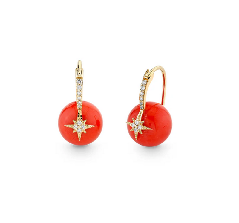 Founded in 2001 by Rosanne Karmes, Sydney Evan is a Los Angeles brand known for classic pieces with a big personality. These earrings blend celestial inspiration with natural vibrancy. Beneath a 14K white pave set starburst are 10mm coral beads and are hanging on pave set 14K hooks.