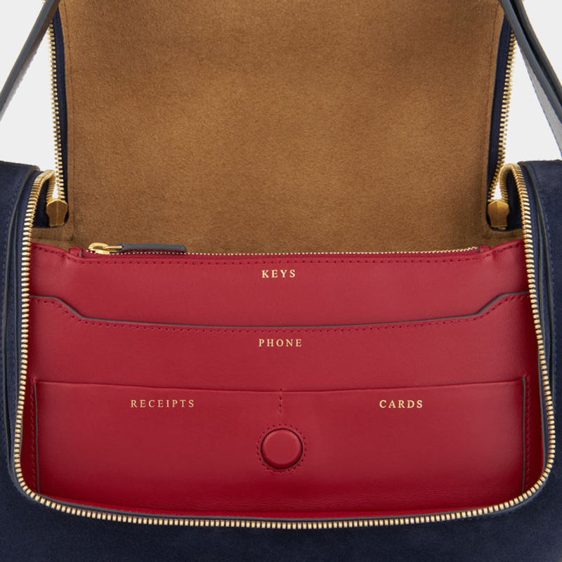 Crafted from marine-blue suede and shiny calf leather, it opens via a double zip to reveal labelled sections in vampire-red leather for your phone, glasses, earphones, keys, receipts, and cards.